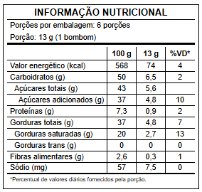 Ingredientes: açúcar, leite em pó, manteiga de cacau, cacau, manteiga clarificada, castanha de caju, maltodextrina, açúcar invertido, avelã, castanha do pará, xarope de glicose, café, emulsificante lecitina de girassol, extrato natural de baunilha e regulador de acidez bicarbonato de sódio. CONTÉM LACTOSE. NÃO CONTÉM GLÚTEN.
